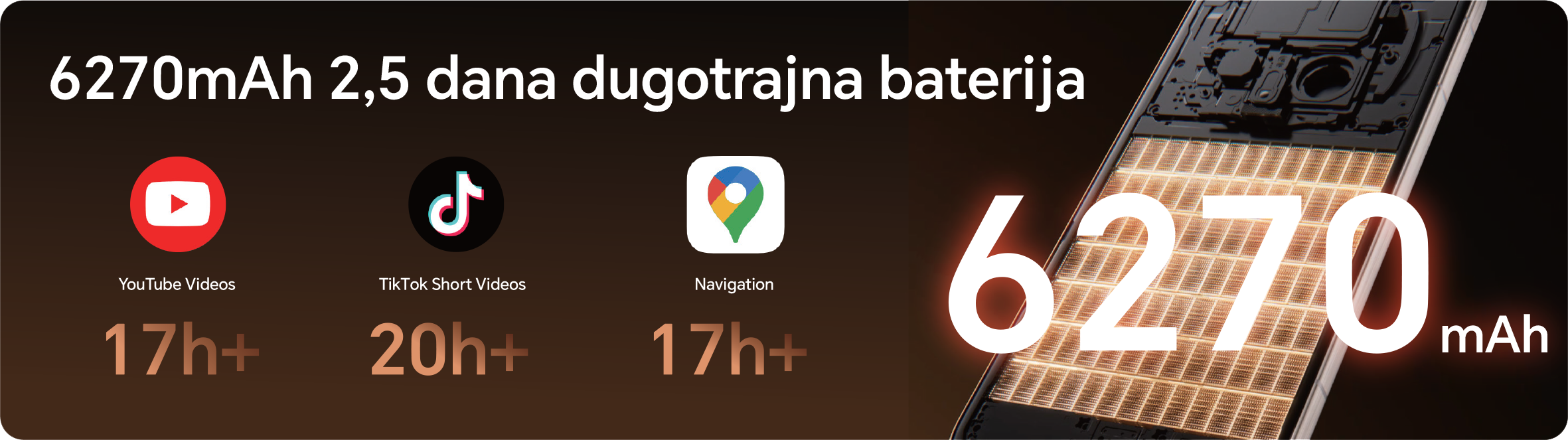 Baterija Koja Traje i Traje – 6270 mAh Zaboravite na punjač tijekom dana. Nova generacija silicij-ugljikove baterije ogromnog kapaciteta od 6270 mAh osigurava autonomiju do 2.5 dana. Kada vam zatreba energije, tu je munjevito brzo 100W žičano i 80W bežično HONOR SuperCharge punjenje.